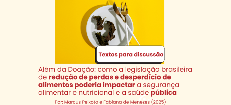 O Núcleo de Estudos e Pesquisas da Consultoria Legislativa do Senado Federal publicou o Texto para Discussão nº 353, intitulado “Além da Doação: como a legislação brasileira de redução de perdas e desperdício de alimentos poderia impactar a segurança alimentar e nutricional e a saúde pública”, de autoria de Marcus Peixoto e Fabiana de Menezes Soares. O estudo analisa como a legislação brasileira sobre perdas e desperdício de alimentos (PDA) pode contribuir para a segurança alimentar e nutricional (SAN) e para a saúde pública, avaliando o marco legal vigente e as propostas em tramitação no Congresso Nacional.